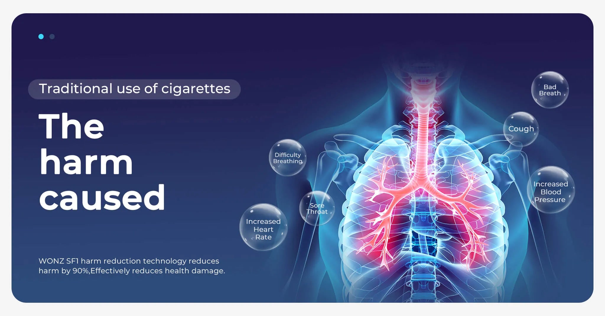 Reports from CNAS accredited testing institutions prove that, compared to lighting a cigarette, using WONZ can effectively reduce carbon monoxide by 92.8%, reduce tar by 85.6%, and also reduce formaldehyde, heavy metals, and over twenty other main harmful substances, with an overall effectiveness of over 90%.